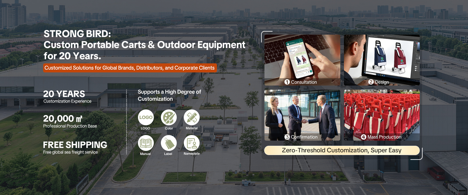 As a trusted global manufacturing partner, STRONG BIRD specializes in R&D, production and customization of portable shopping carts, outdoor products and handbags. With 20 years of expertise, a 20,000㎡ modern facility and top-tier export performance, we offer full-cycle OEM/ODM services, low MOQs, free global sea freight, strict quality control, 24-hour responses and dedicated account management. Guided by the philosophy “Professional customization, Elevate Your Brand Mobility”, we deliver efficient, cost-effective solutions for global partners.