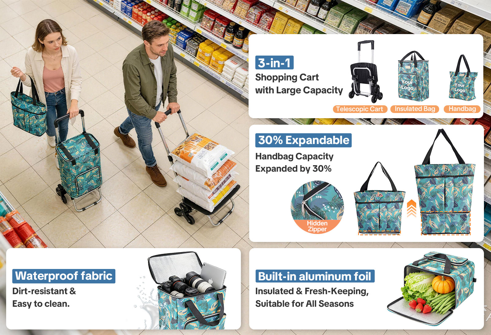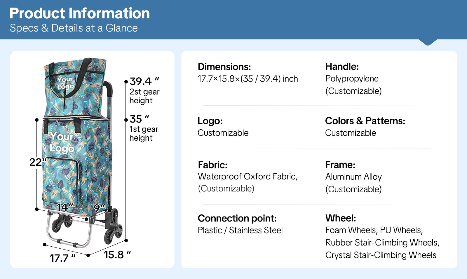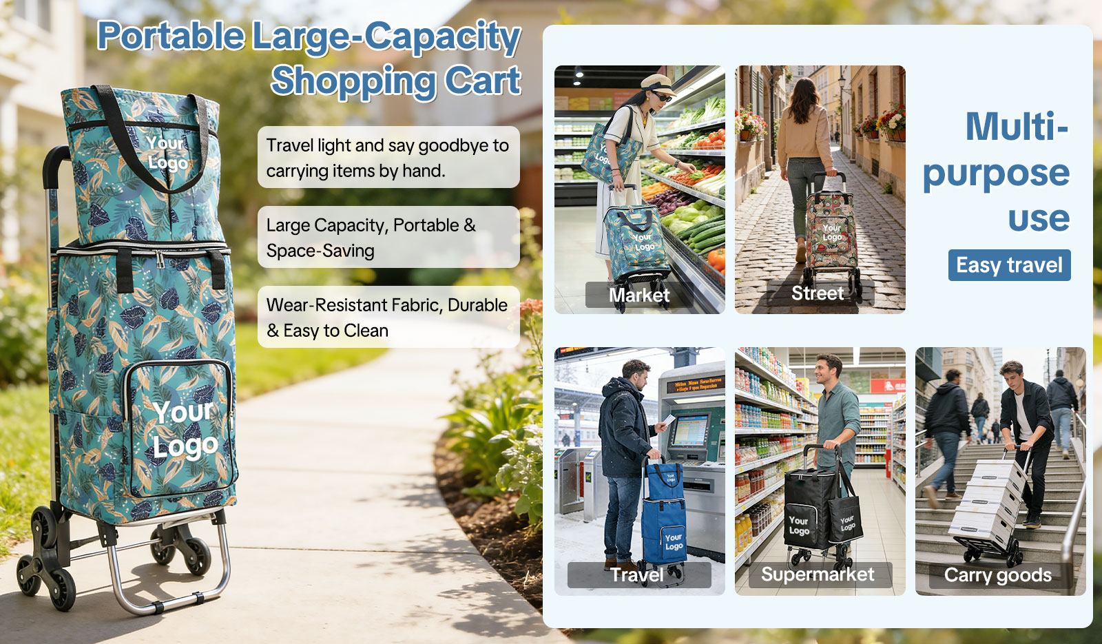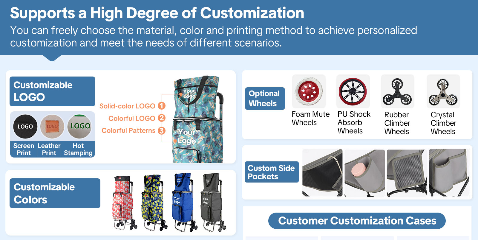 For businesses or brands, this cart supports custom logo printing via silk screen, heat transfer, or embroidery, making it perfect for corporate gifts, promotional giveaways, and private-label resale.
