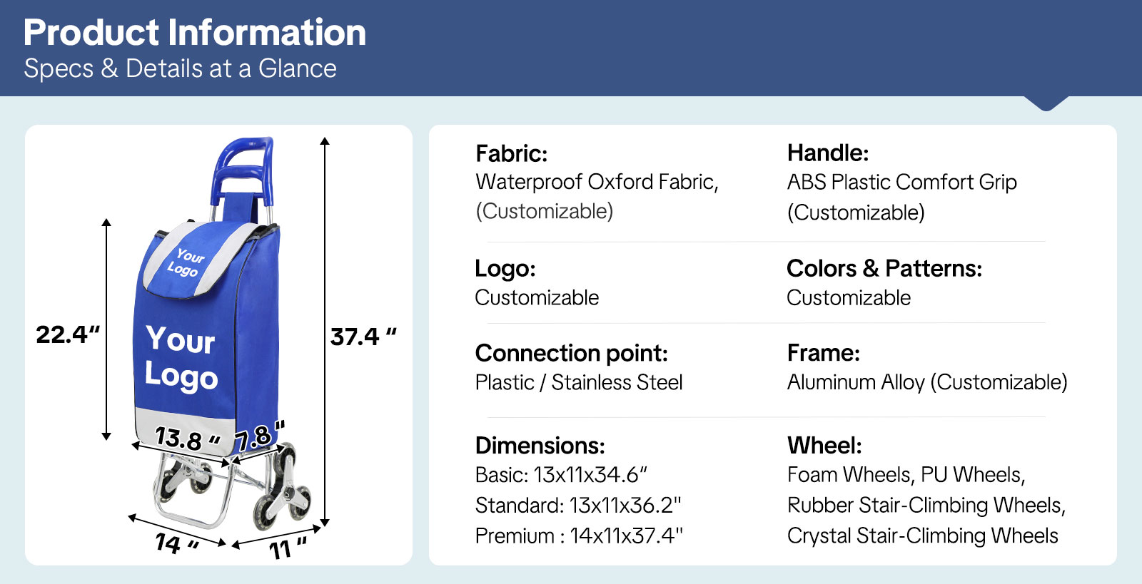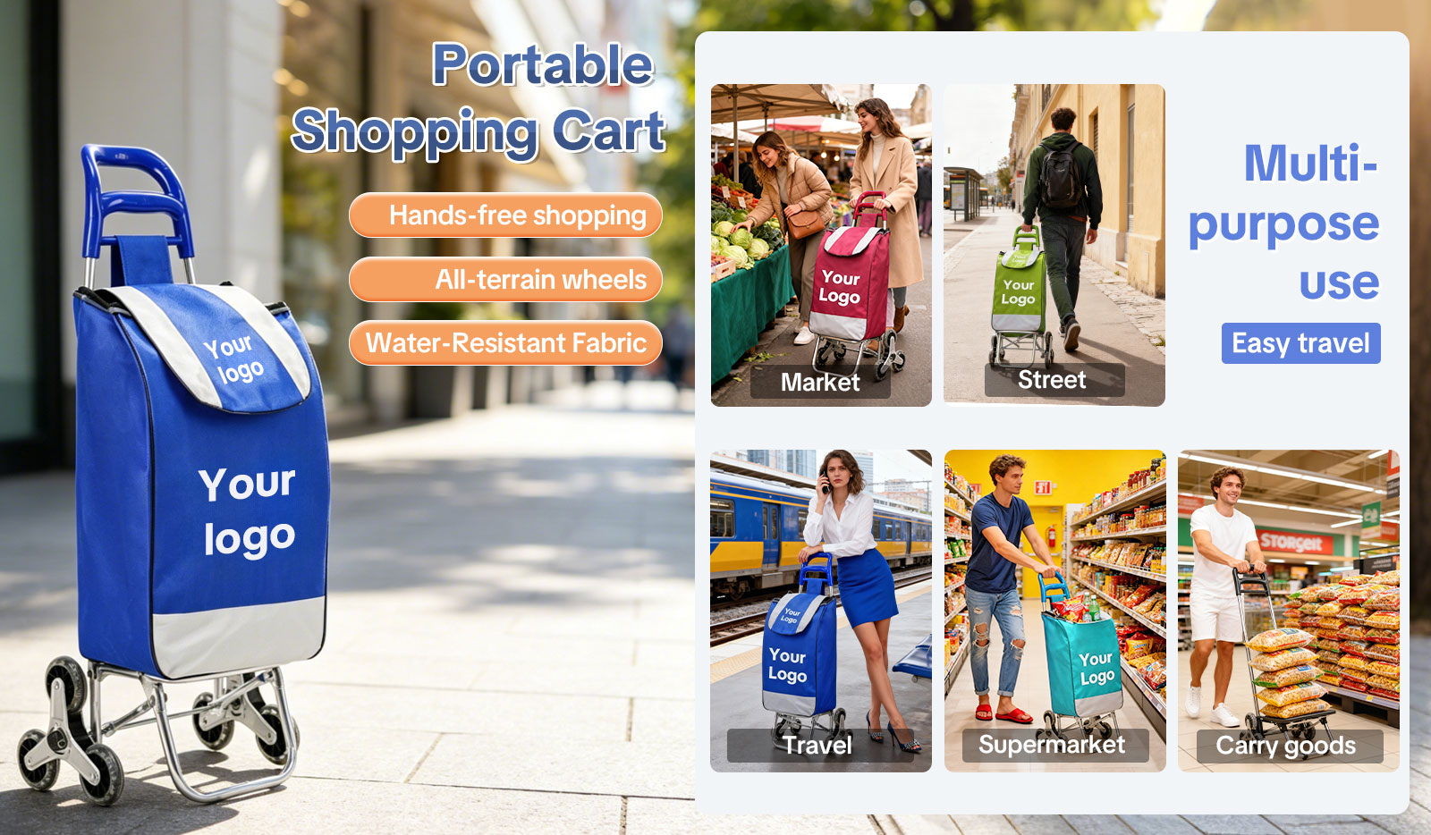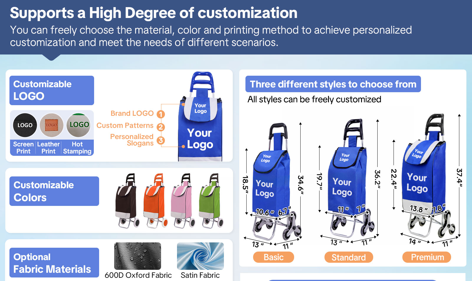 For businesses and brands, the cart supports custom logo printing through silk screen, heat transfer, or embroidery, making it a great option for corporate gifts, promotional giveaways, and private-label resale.