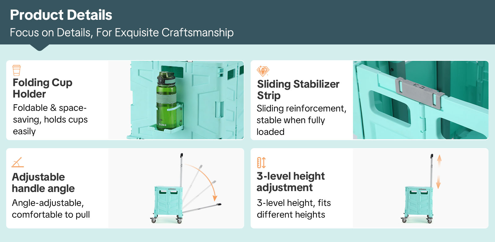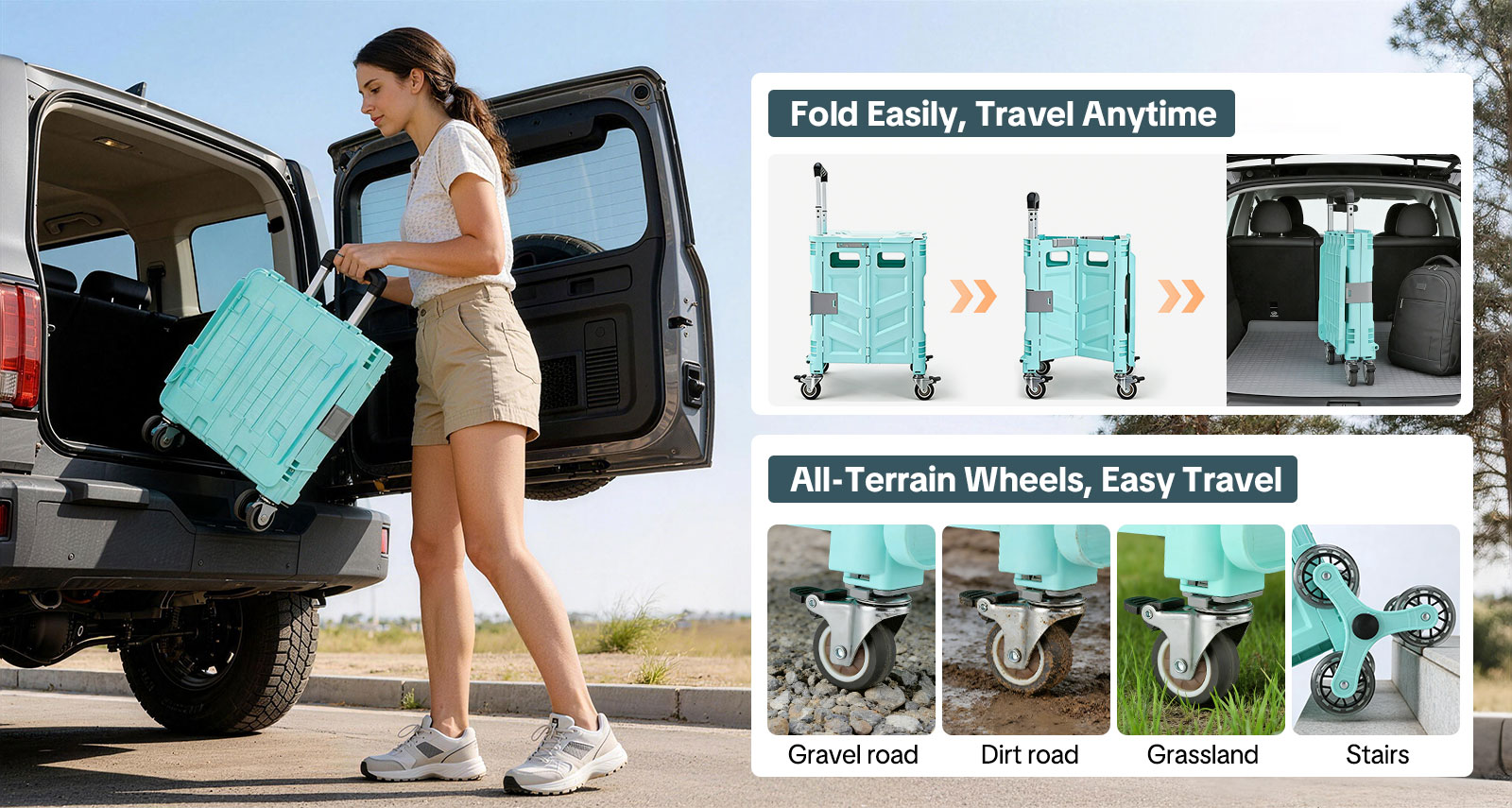 The stair-climbing triple-wheel system allows you to navigate stairs smoothly, saving your back from heavy lifting while making grocery trips, laundry transport, and moving boxes much easier. Equipped with smooth, heavy-duty wheels, it also rolls effortlessly across various surfaces, including tile, hardwood, and pavement, providing reliable maneuverability indoors and outdoors.