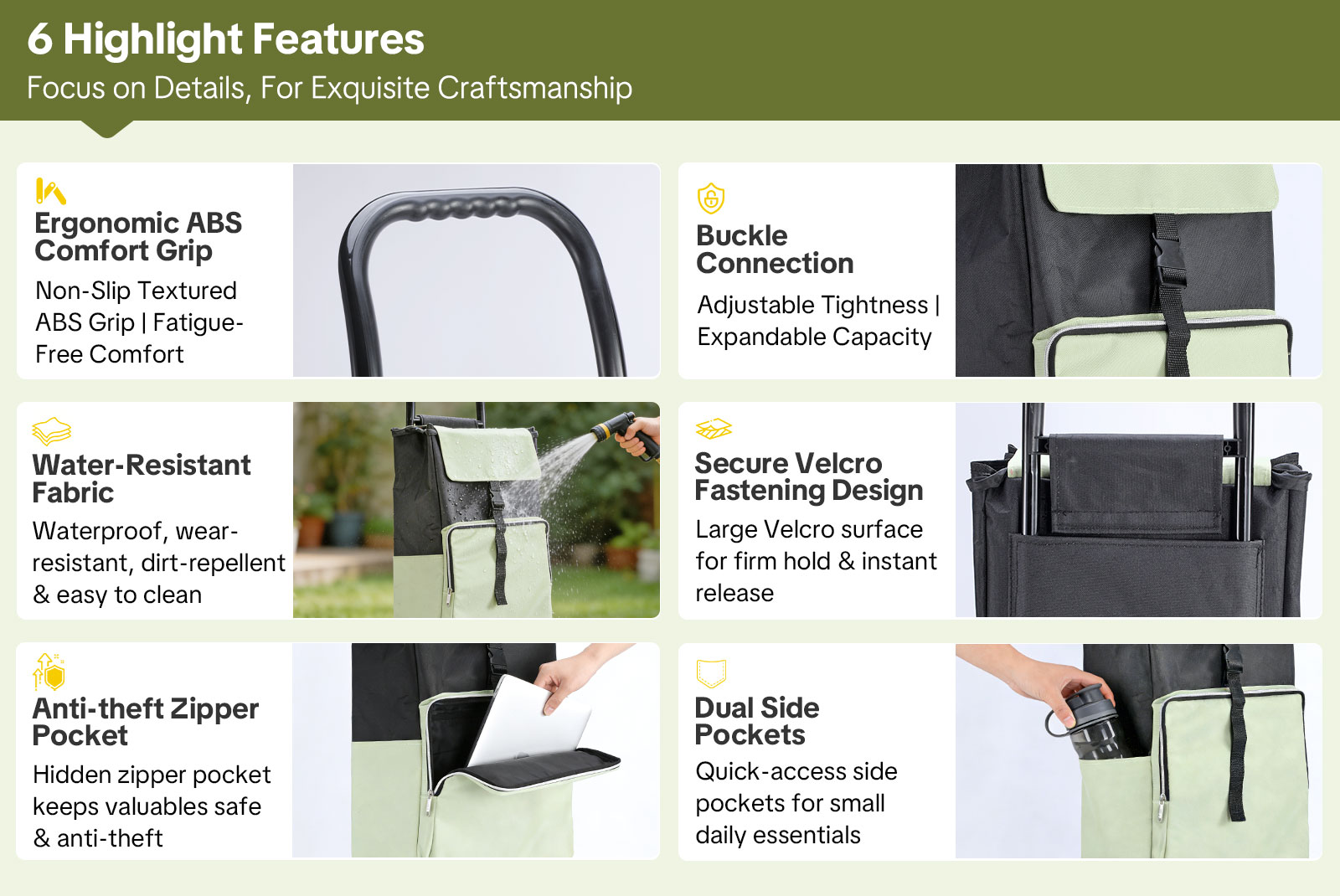 This cart includes a removable 600D Oxford fabric bag, perfect for carrying groceries, laundry, office supplies, or travel essentials. The bag attaches securely to the frame but can be easily removed for cleaning, making it highly versatile for everyday tasks.