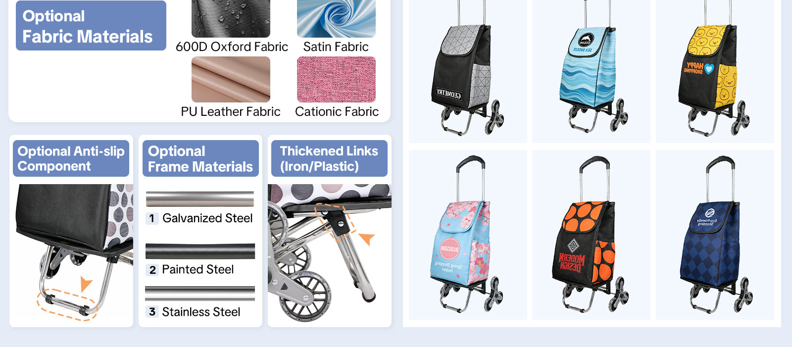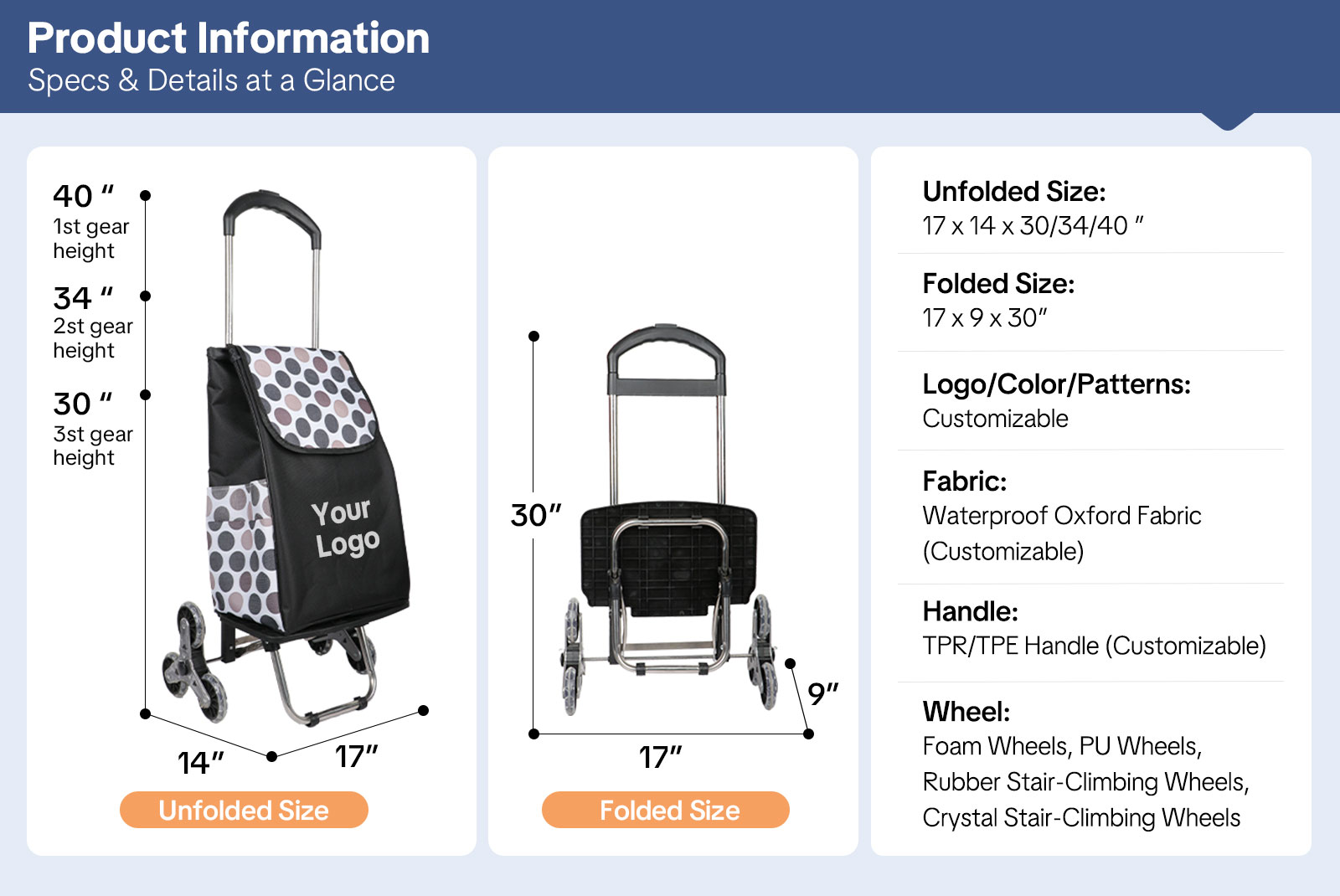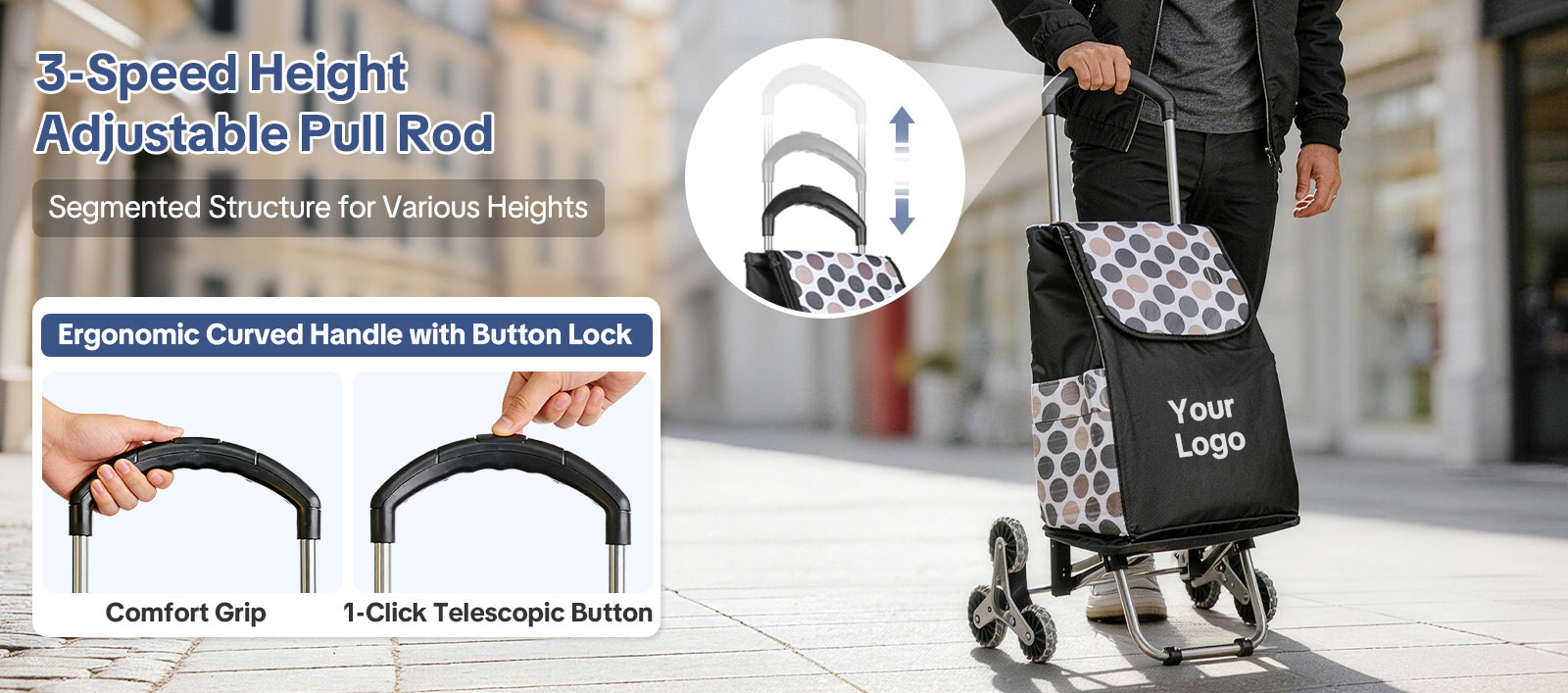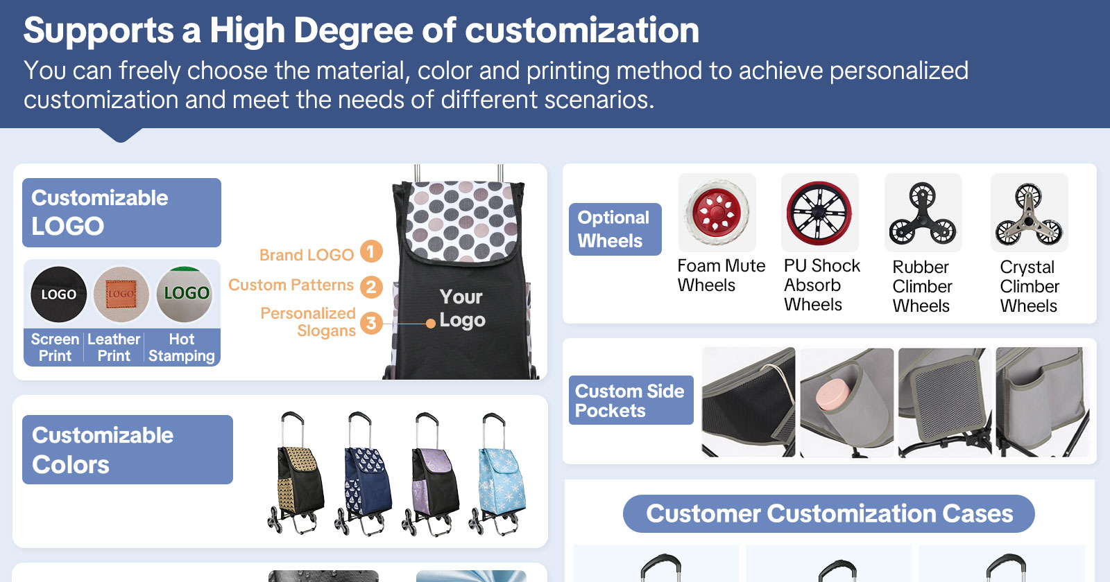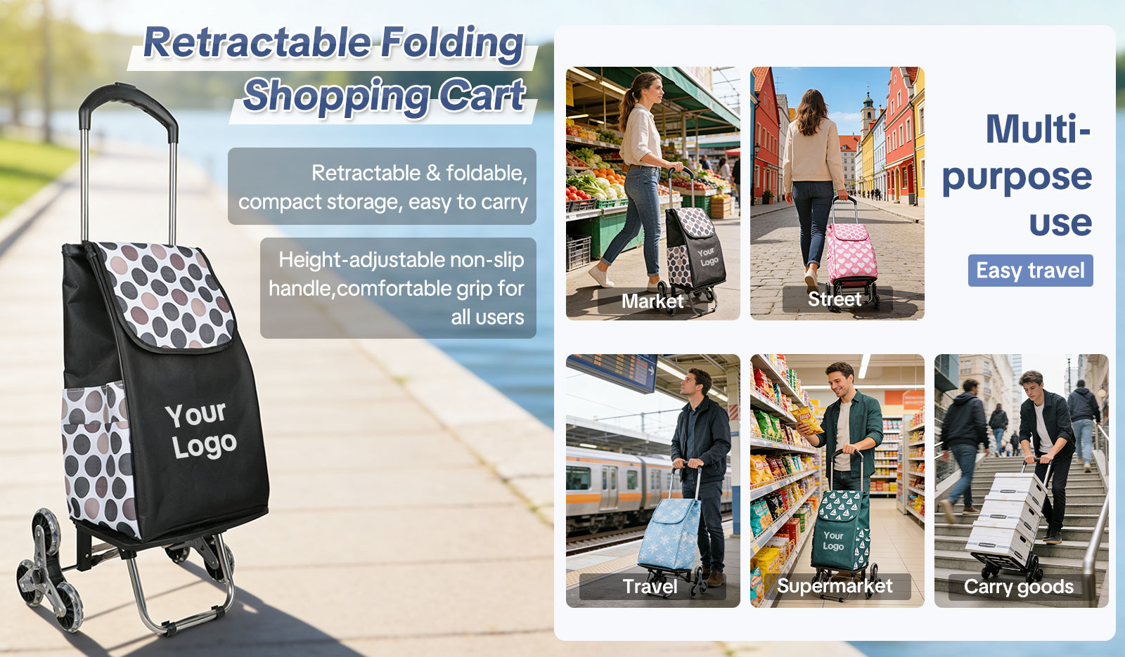 For businesses and brands, the trolley supports custom logo printing through silk screen, heat transfer, or embroidery, making it an excellent choice for corporate gifts, promotional giveaways, and private-label resale.