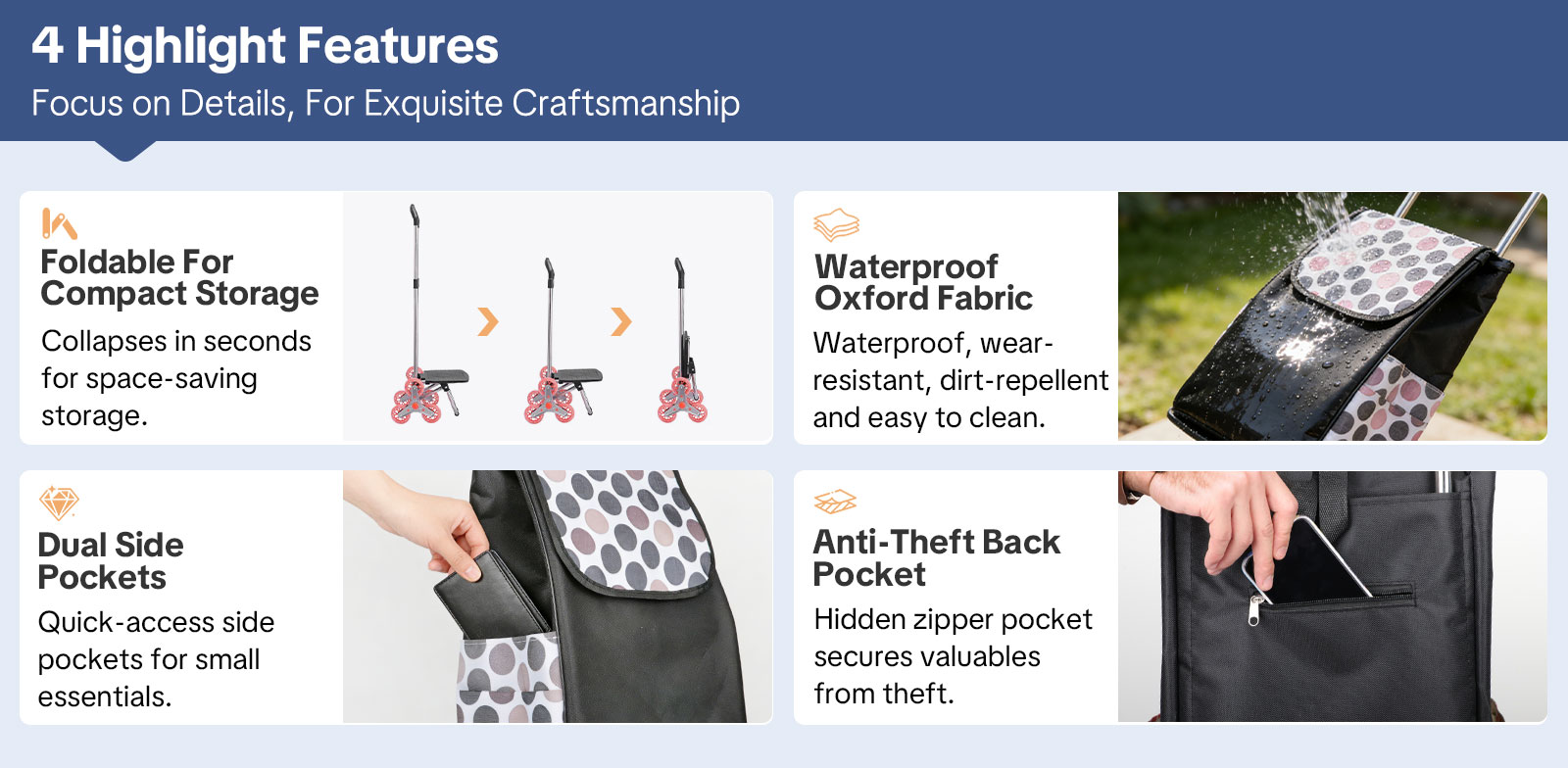 A removable 600D Oxford fabric bag adds versatility, perfect for groceries, office supplies, travel essentials, or everyday items. The bag attaches securely to the frame but can be easily removed for cleaning, providing convenience and hygiene for everyday use.