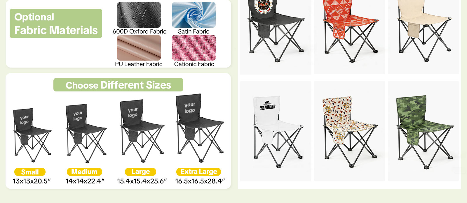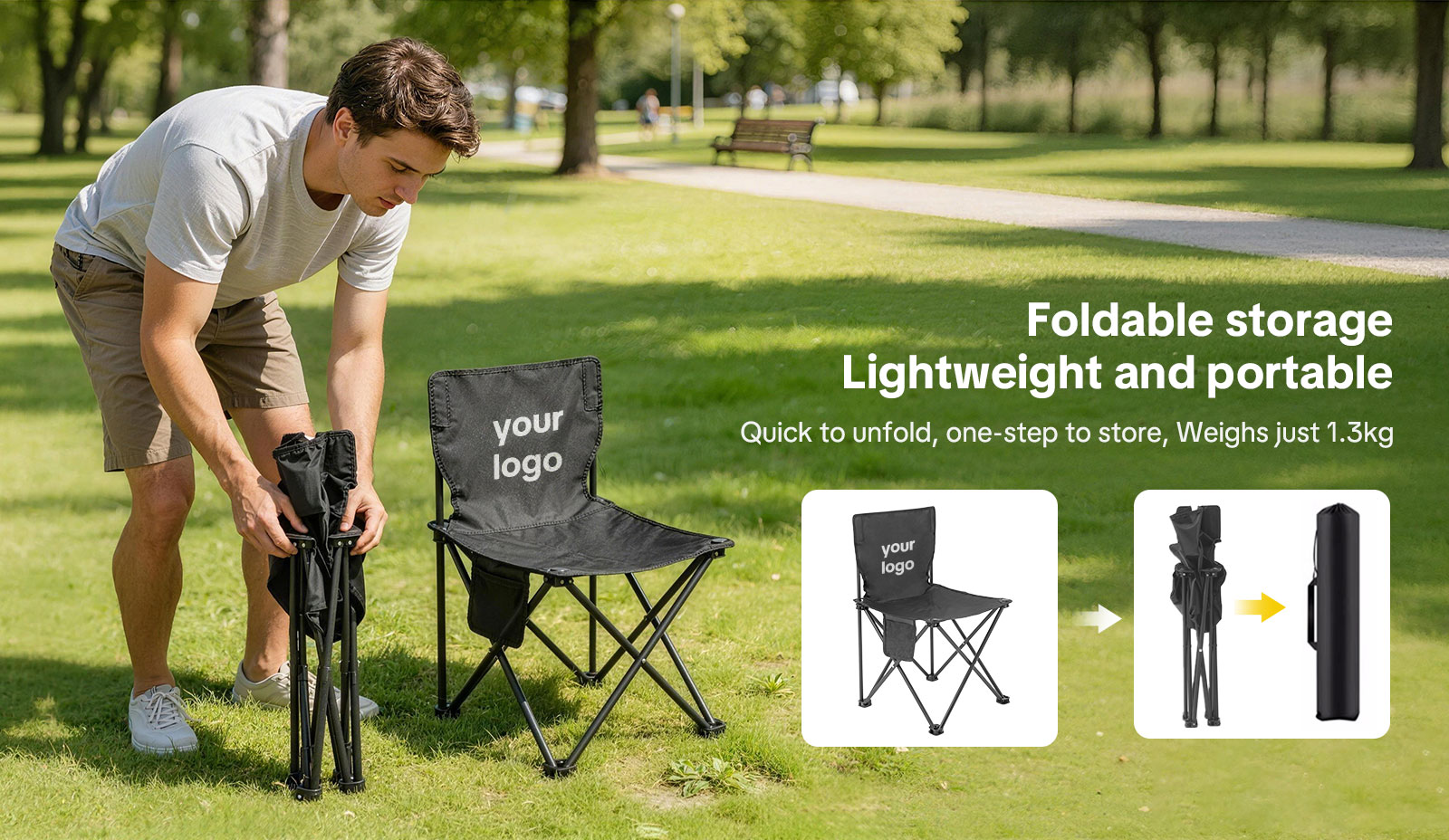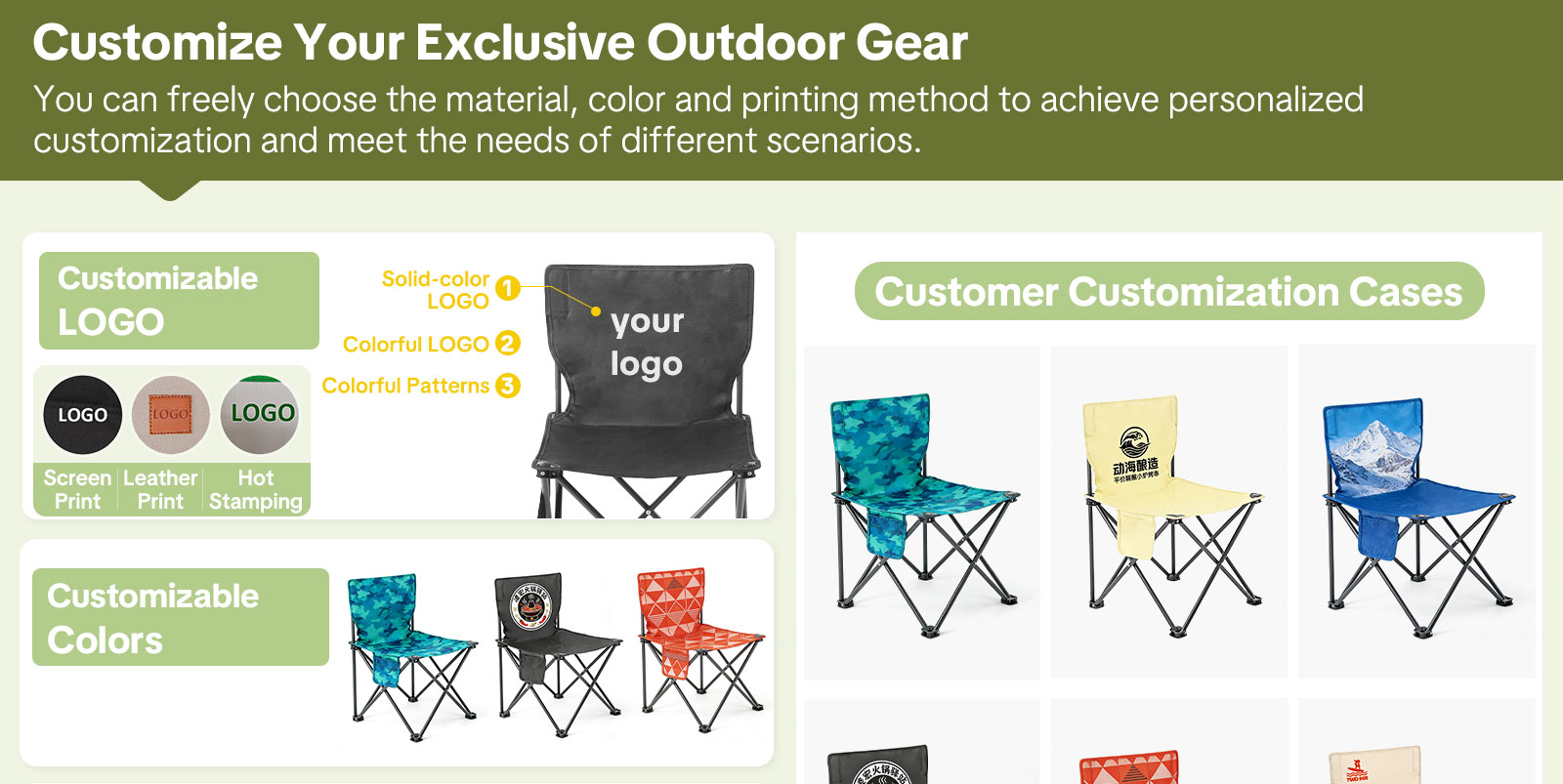 Custom Logo Printing – Choose from silk screen, heat transfer, or embroidery. Perfect for corporate gifts, branding, private label, employee recognition, or custom logo folding chair promotions.
