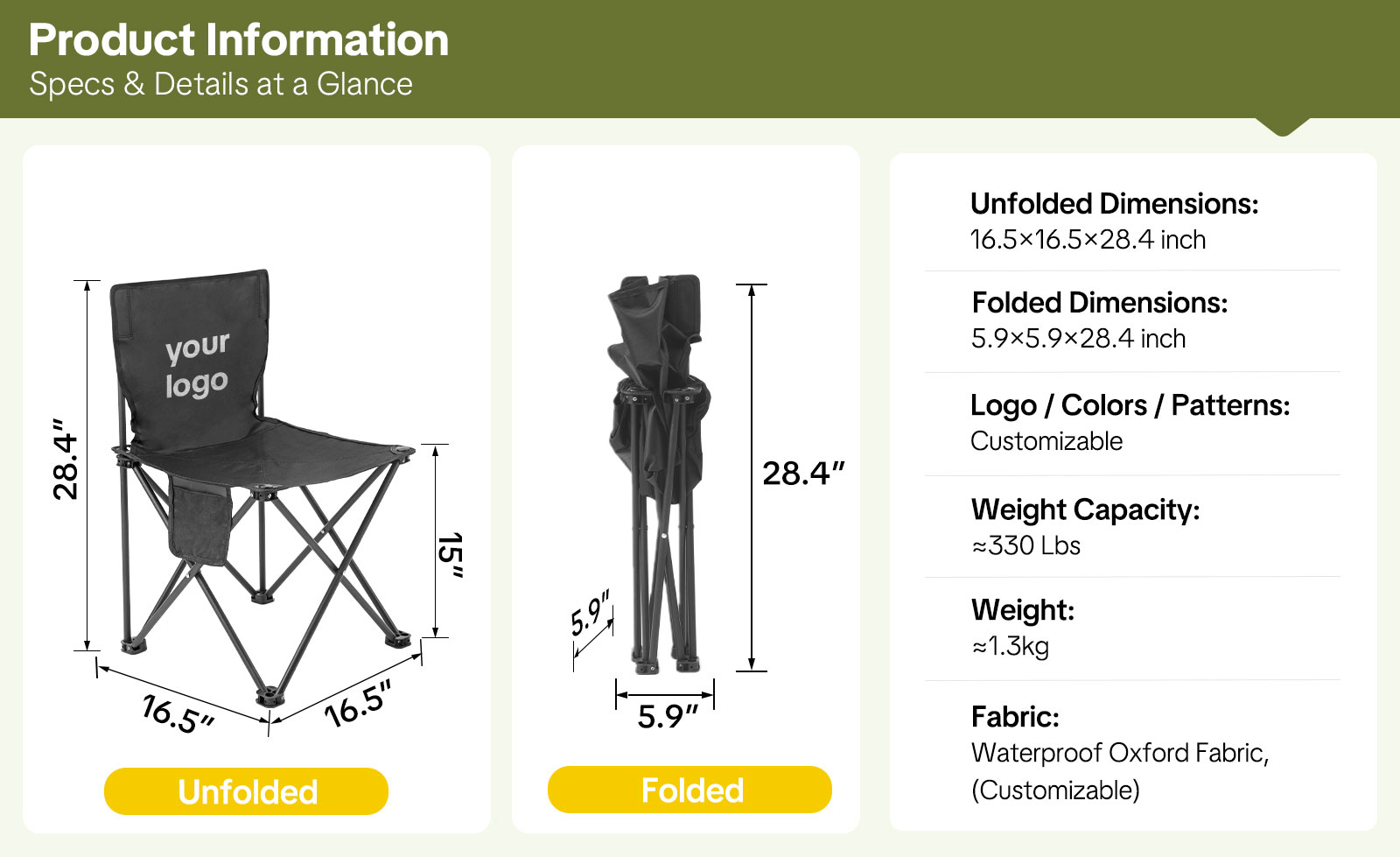 Supports 330+ lbs – Heavy-duty steel frame and 600D Oxford fabric provide lasting durability and stability. Perfect as a heavy-duty folding chair, customizable camping chair, or personalized folding chair for extended use.